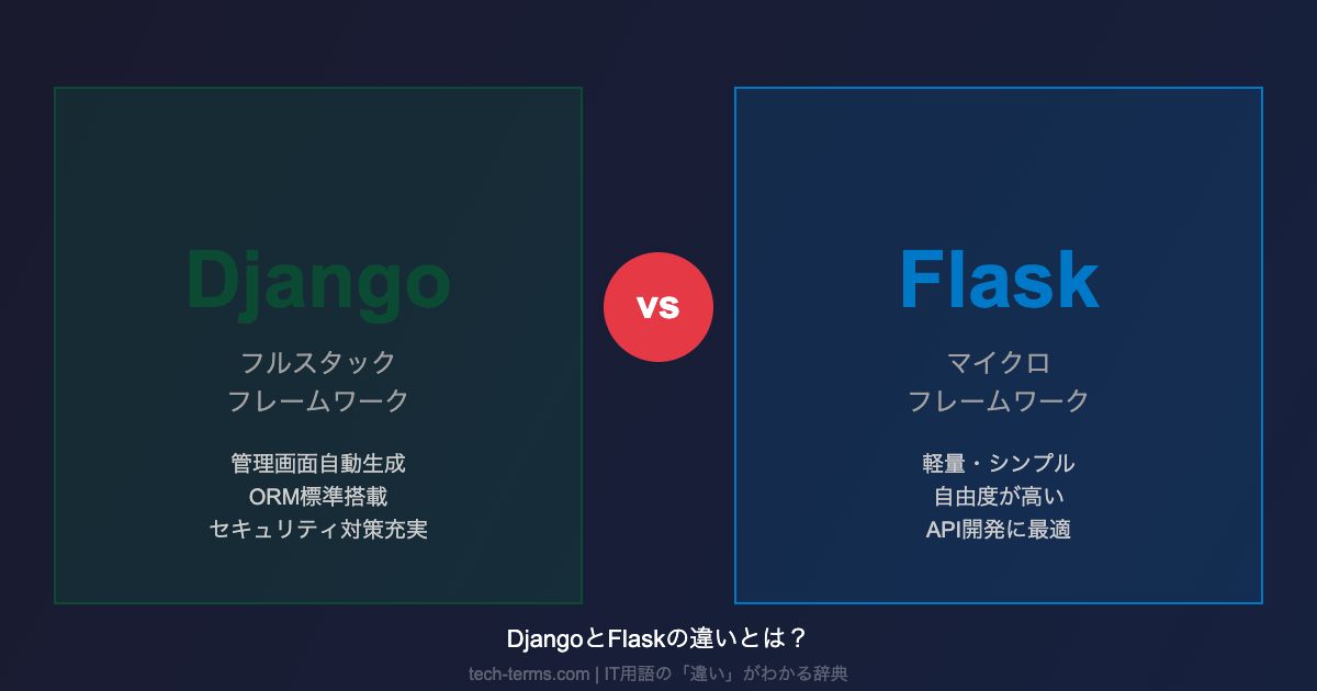 DjangoとFlaskの違いをあらためて整理すると、Djangoは「Web開発に必要な機能がすべて揃った、大規模開発に強いフルスタックフレームワーク」、Flaskは「シンプルで自由度が高く、小規模開発やAPI構築に最適なマイクロフレームワーク」です。